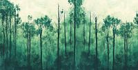 Een dicht bos met hoge, slanke bomen die zich uitstrekken naar de hemel. De zachte, waterverfachtige texturen geven het beeld een mysterieuze en dromerige uitstraling. De achtergrond is gehuld in een subtiele mist. Het bos lijkt eindeloos en roept een sfeer van kalmte en introspectie op.