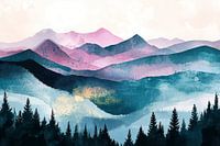 Een sereen berglandschap in zachte pasteltinten waar turquoise en roze de boventoon voeren. De gelaagde compositie toont majestueuze bergtoppen die opgaan in een dromerige nevel, terwijl op de voorgrond een silhouet van dennenbomen de basis vormt. Een vleugje goud in het middenveld geeft het werk een bijzondere diepte en mysterieuze…