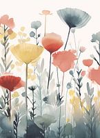 Dit betoverende kunstwerk, "Mistige Bloemenpracht", toont een veld vol bloemen in waterverf, met sprankelende tinten geel, blauw en rood. De kunstenaar heeft deze natuurlijke schoonheid vastgelegd in een stijl die doet denken aan lichtroze en grijze decoratieve achtergronden, waarin de kleuren licht oranje en wit subtiel samensmelten.…