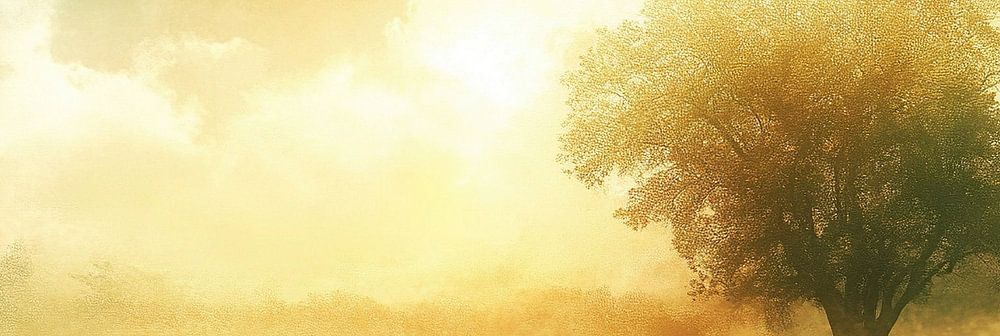 Mistige Boom - In dit landschap schilderij zie je een grote boom die staat in een gouden veld, omringd door mist en een warme, zachte lucht in verschillende tinten van groen en geel.
