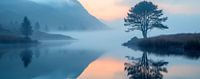 Het is vroeg in de ochtend, wat te zien is aan het subtiele, warme licht dat door de koele mist schijnt. De bomen aan de rand van het meer, waaronder één grote solitaire boom op een rots, worden scherp weerspiegeld in het gladde wateroppervlak. De bergen op de achtergrond vervagen in de mist, waardoor ze een bijna etherische uitstraling krijgen en een gevoel van diepte en mysterie toevoegen. De kleuren zijn rustig en ingetogen, met tinten van blauw en lichtroze, wat bijdraagt aan de serene en meditatieve sfeer van het tafereel.