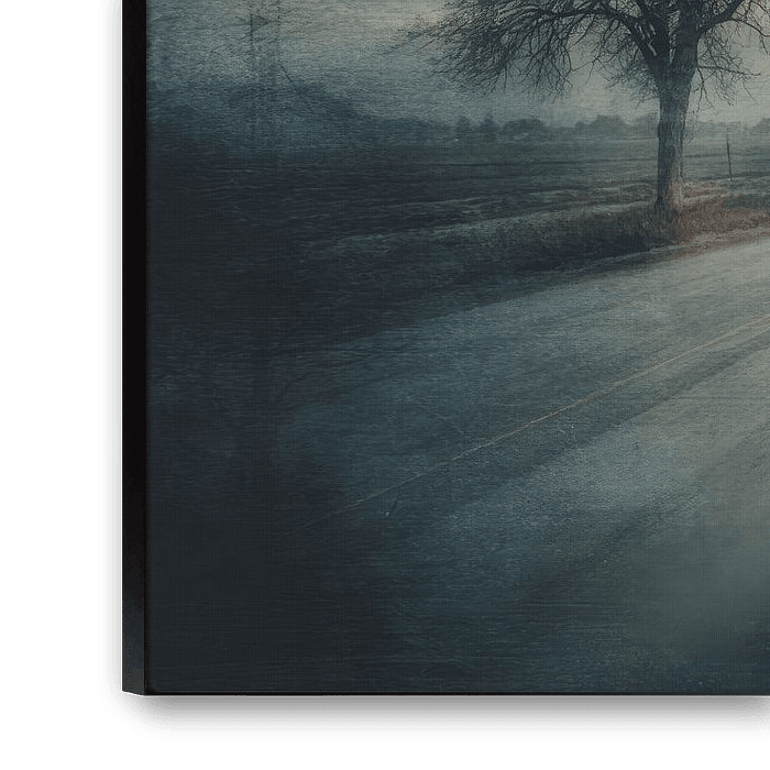 Deze blauw en rode fine art foto van een verlaten mistige weg voelt mysterieus en sfeervol aan en brengt een filmische stilte in je interieur. Het beeld ademt nostalgie en een subtiel dramatische spanning die de ruimte onmiddellijk karakter geeft. Prachtig passend in Industrieel, Modern Chic, Eclectisch en Minimalistisch interieur en een bijzondere keuze voor hal, woonkamer, praktijkruimte of kantoor.