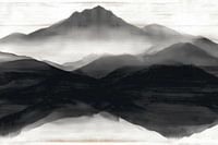 Een horizontaal landschap met zachte, etherische bergen gehuld in mist. De compositie maakt gebruik van een monochroom palet met diepe, houtskoolkleurige bergtoppen en een spiegelende weerspiegeling in het water beneden, weergegeven met fijne horizontale texturen.