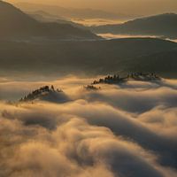 Mistige bomen met Pieniny bergen op de achtergrond in het licht van de zonsopgang, Polen
