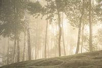 Opkomende zon in de bossen. Door de lichte mist ontstaat een prachtige sfeer.