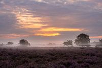 Mistige zonsopkomst in de Loonse en Drunense Duinen, met de heide in bloei.