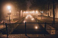 Foto genomen vanaf een brug met uitzicht op de gloeiende straatverlichting op een mistige nacht.