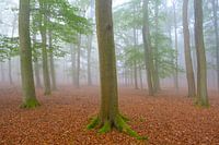 Beukenboslandschap tijdens een mistige herfstochtend. De bosgrond is bedekt met bruin gevallen bladeren terwijl er nog groene bladeren aan de bomen zitten. De mist geeft het bos een desolate en deprimerende sfeer.