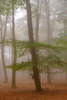 Beukenboslandschap tijdens een mistige herfstochtend. De bosgrond is bedekt met bruin gevallen bladeren terwijl er nog groene bladeren aan de bomen zitten. De mist geeft het bos een desolate en deprimerende sfeer.