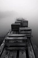 Dit unieke ontwerp toont een verlaten houten steiger die zich uitstrekt in een dichte, mysterieuze mist. De eenvoud van de opstelling met de verweerde houten kratten creëert een serene en enigszins sombere sfeer. De mist verbergt de horizon, waardoor het lijkt alsof de steiger eindeloos doorgaat, wat bijdraagt aan het gevoel van eenzaamheid en rust. Dit monochrome ontwerp is perfect voor liefhebbers van minimalistische en moderne kunst en kan een unieke sfeer brengen in elke ruimte. De zwart-witte kleuren benadrukken de textuur van het hout en versterken de mystieke uitstraling van het beeld. Een prachtige aanvulling voor wie houdt van mysterieuze landschappen en rustige interieurs.