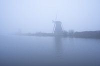 Mistige ochtend in het bekende Kinderdijk bij Alblasserdam. Op een koude morgen met zeer dikke mist de molens van werelderfgoed Unesco in een mooie zachte tafereel.