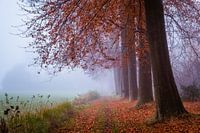 Bomen langs een lang pad op een mistige dag met mooie herfstbladeren.