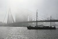 Een mistige morgen aan de Nieuwe Maas. Boten varen voor De Erasmusbrug en De Rotterdam de Nieuwe Maas op.