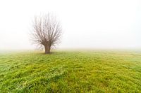 Op een mistige ochtend staat deze prachtige boom in het grasveld helemaal alleen