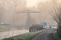 Op een mistige koude ochtend langs de rivier waar een mooie woonboot ligt afgemeerd
