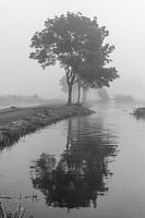 Op een mistige morgen langs de Kadijkse Vliet, een smalle landweg tussen Schoonhoven en Bergambacht. Deze bomen, die nog blad hebben, want de herfst is pas net begonnen, staan vlak voor zonsopkomst in een mistig landschap.