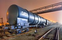 Mistige nacht scène met blauwe rail auto tegen oranje hemel van Tony Vingerhoets