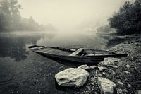 Een bootje dat betere tijden heeft gekend, volgelopen langs de Dordogne.
