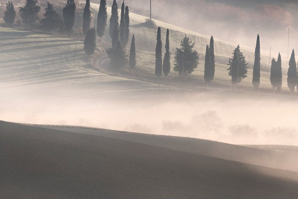 Mistige ochtend in Toscane. Een boerderij, een met bomen omzoomde weg en glooiende heuvels in Val d'Orcia, Pienza, Toscane, Italië.