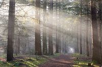 Zonnestralen komen door de bomen heen tijdens het gouden uurtje in de ochtend op de Utrechtse heuvelrug in het Zeisterbos!