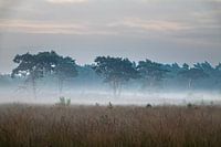 Een mystieke, moody sfeer op een vroege ochtend in het Grensparkt De Zoom-Kalmthoutse Heide dankzij de ochtendnevel. De foto is genomen net voor zonsopgang. De grillige bomen vormen silhouetten in de mist.