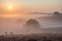 Een prachtige mistige ochtend op de Posbank in Gelderland tijdens de bloei van de heide.
