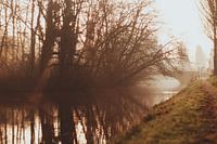 Een mistige zonsopgang op de Westbroekkade. Naast het water van het Westbroekpark Scheveningen / Den Haag. In de mysterieuze mist verschijnen het park, water, vogels, de bomen en sommige fietsers in de verte. Een magisch moment.