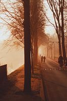 Een mistige zonsopgang op de Westbroekkade. Naast het water van het Westbroekpark Scheveningen / Den Haag. In de mysterieuze mist verschijnen het park, water, vogels, de bomen en sommige fietsers in de verte. Een magisch moment.