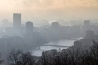 Prachtige mysterieuze opname van de skyline van Luik (Liege), Belgie, op een mistige zonnige winterochtend, met de rivier de maas (meuse) door de stad