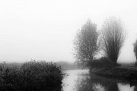 Zwart-wit foto van een mistige ochtend bij de Watermolenbeek tussen Roosendaal en Nispen (Brabant)
