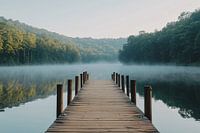 Mistige steiger bij bosmeer van Art & Soul Creations