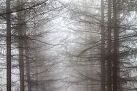 Prachtige opname op een mistige ochtend van een boslaan met kale bomen in het Roekelse bos bij de Hoge Veluwe in de herfst