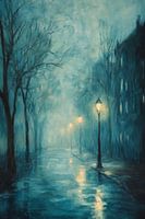 Een mysterieuze schemering hult de straat in zachte blauwtinten, terwijl de glinsterende weerspiegelingen op het natte trottoir de droom van een slaperige avond oproepen. Delicate silhouetten van kale bomen doemen op, omlijst door het glinsterende licht van de straatlantaarns, die als vuurtorens in de schemering schijnen en een melancholische sfeer creëren.