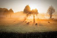 Gouden licht tijdens deze zonsopkomst in de weilanden met schapen rond kasteel Cartils in het Zuid-Limburgse Heuvelland (Kapolder, Nederland).