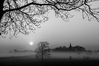 Foto in zwart-wit vanaf het Meertje in Nijmegen, zicht op het kerkje van Persingen met boom en grondmist op de voorgrond.