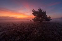 Een prachtig gekleurde mistige zonsopkomst op de Veluwe.