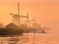 Een magische mistige zonsopkomst bij Kinderdijk. De mannen in het bootje kwamen precies op het juiste moment voorbij varen. Foto gemaakt door Ellen van den Doel.
