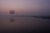 Een prachtig Hollands rivierenlandschap met een boom op een krib tijdens een mooie mistige zonsopkomst langs de rivier de Lek.