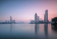 Zonsopkomst met mist vanag Katendrecht met de kop van zuid en de zalmhaventoren op de achtergrond.
