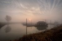 In de vroege ochtend, gehuld in een zachte deken van mist, ontvouwde zich een betoverende zonsopkomst bij de haven. De mist omhulde het boothuis en gaf het een mysterieuze uitstraling,