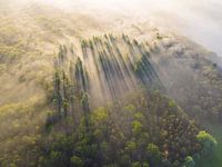 Lange schaduwen van de toppen van de naaldbomen over het omringende bos in Nationaal Park Drents-Friese Wold. De foto is genomen tijdens een mistige zonsopkomst.