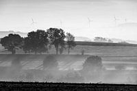 De heuvels rond Eys in de mist tijdens zonsopkomst. Op de achtergrond de windmolens op de grens bij Bocholtz.