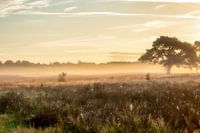 Een mistige zonsopkomst op de Hilversumse heide. De mist en de warme, gouden gloed van de zon maken deze foto erg sfeervol.