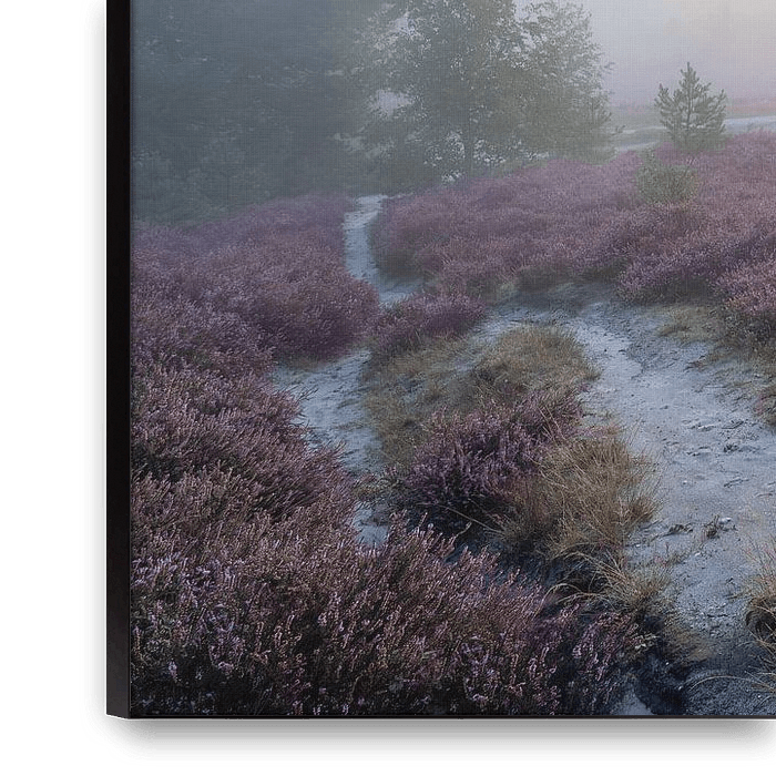 Een schilderachtige sfeervolle landschapsfoto van de op de bloeiende heide tijdens een mooie mistige zonsopkomst. Het mooie zachte warme goudenlicht van de opkomende zon schijnt fraai over de paars bloeiende heide. En geeft het werk een prachtige schilderachtige, serene en warme sfeer. In dit mooie landschapskunstwerk zie je de stilte…