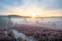 Een schilderachtige sfeervolle landschapsfoto van de op de bloeiende heide tijdens een mooie mistige zonsopkomst. Het mooie zachte warme goudenlicht van de opkomende zon schijnt fraai over de paars bloeiende heide. En geeft het werk een prachtige schilderachtige, serene en warme sfeer. In dit mooie landschapskunstwerk zie je de stilte en schoonheid van de natuur met zijn prachtige kleuren. De prachtige wolkenlucht zorgt voor een fraaie dieptewerking in de foto. De prachtige paars bloeiende heide en het zachte goudenlicht van de opkomende zon maken het werk bijzonder warm en kleurrijk. Met dit prachtig landschapskunstwerk als wanddecoratie haal je de stilte en schoonheid van de natuur in huis.