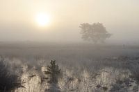 Sfeervolle zonsopkomst met mist op de heide van Hoog Soeren bij Apeldoorn op de Veluwe. Het was op de laatste dag in Februari. Er was mist voorspeld, dus ben ik vroeg op pad gegaan. Precies op tijd op één van mijn favoriete plekken met een prachtige solitaire boom en een ven op de voorgrond.