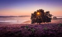 Mistige zonsopkomst op de posbank. De heide is nog mooi paars gekleurd.