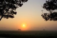 Een mistige zonsopkomst in de Krimpenerwaard. Enkele koeien zijn onverstoorbaar aan het grazen, terwijl het waterige zonnetje door de mist heen prikt.