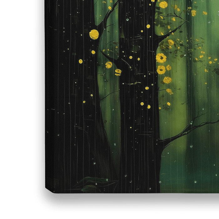 Een stemmig en sfeervol landschapschilderij dat de schoonheid van een regenwoud laat zien.