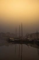 Zonsopgang tijdens de mist in de oude haven van Gouda met mooie spiegeling van de boten in het water.